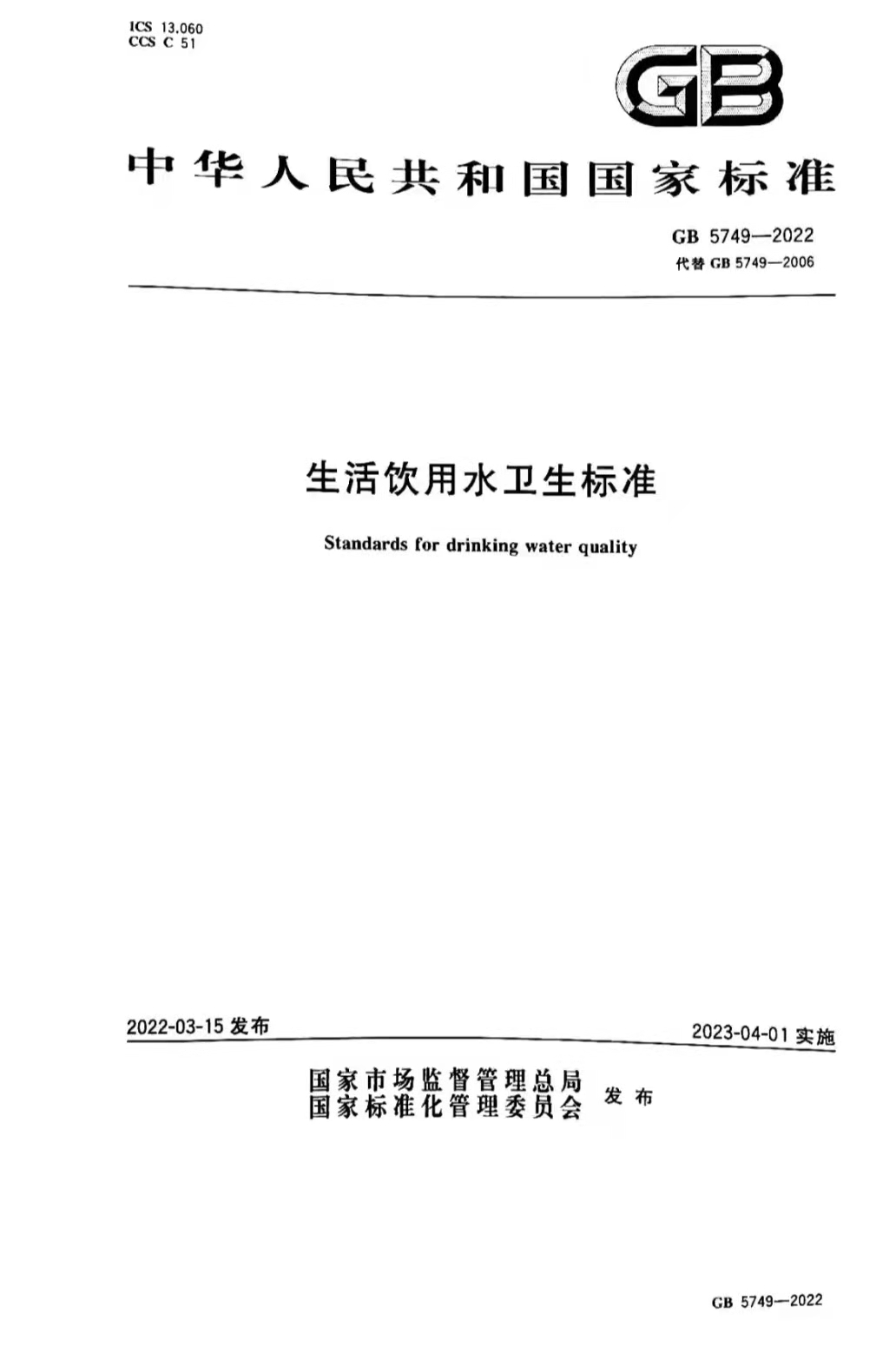 2022年3月15日,國家市場監(jiān)督管理總局和國家標(biāo)準(zhǔn)化管理委員會(huì)聯(lián)合發(fā)布中華人民共和國國家標(biāo)準(zhǔn)公告(2022年第3號)“關(guān)于批準(zhǔn)發(fā)布《生活飲用水衛(wèi)生標(biāo)準(zhǔn)等5項(xiàng)強(qiáng)制性國家標(biāo)準(zhǔn)的公告》”,正式批準(zhǔn)《生活飲用水衛(wèi)生標(biāo)準(zhǔn)》等5項(xiàng)強(qiáng)制性國家標(biāo)準(zhǔn)。
