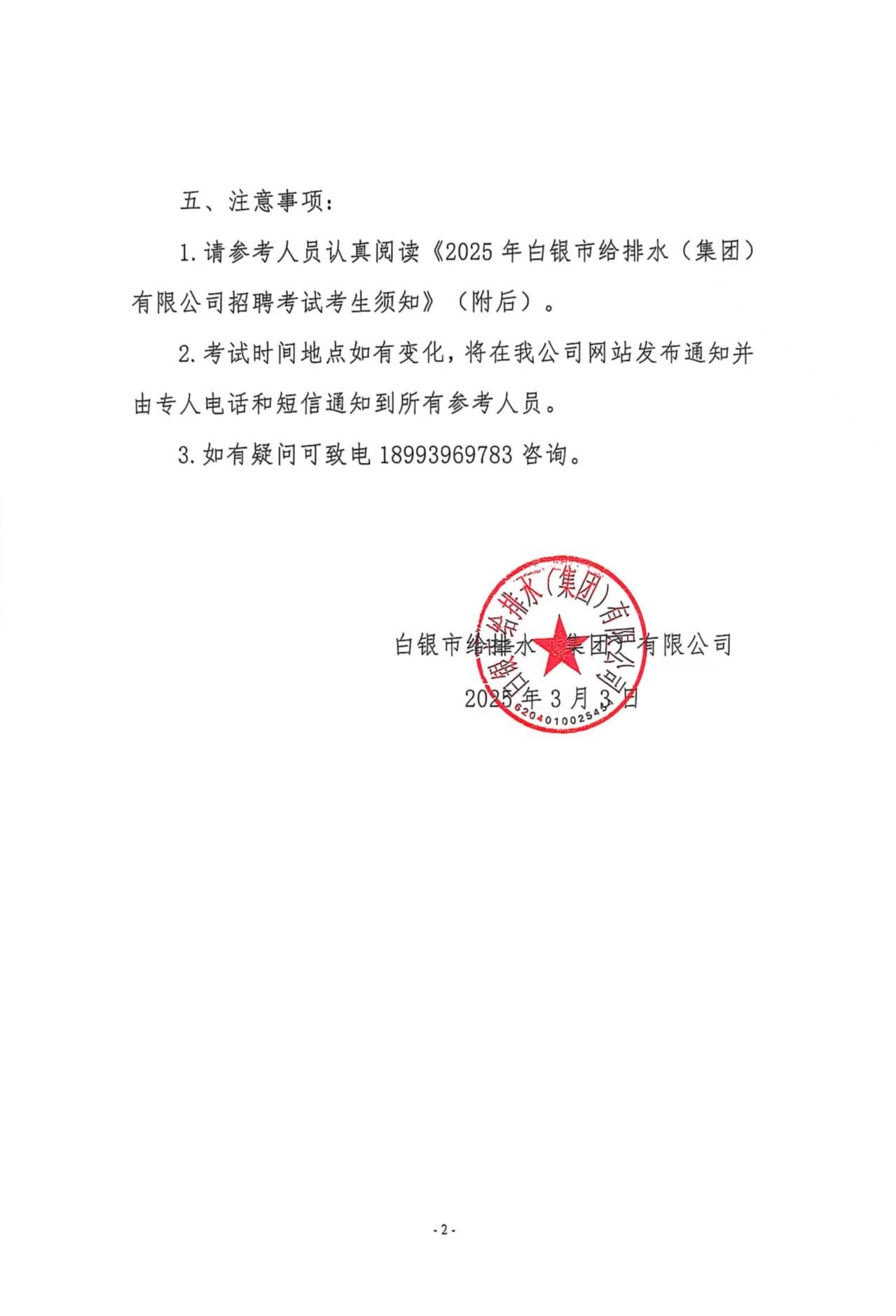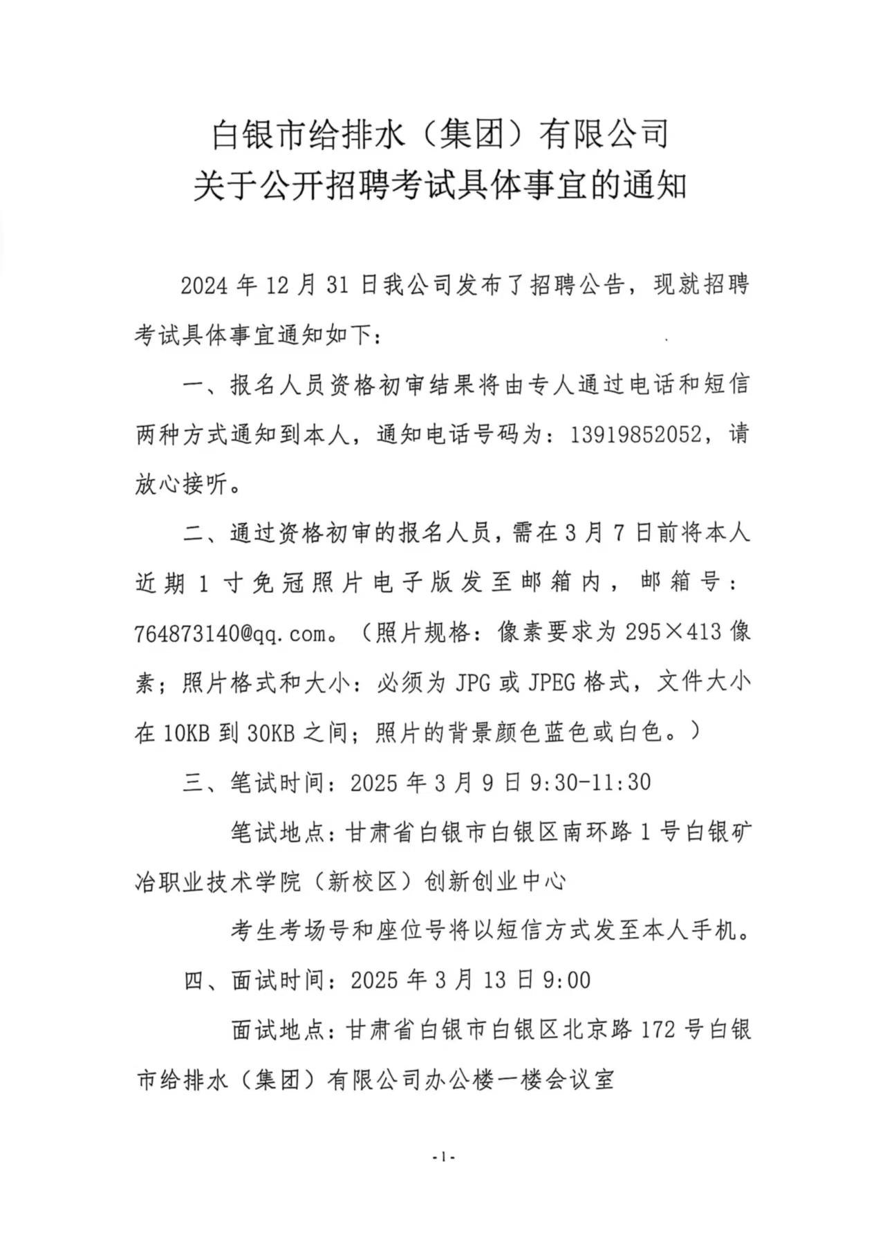 白銀市給排水(集團(tuán))有限公司關(guān)于公開(kāi)招聘考試具體事宜的通知