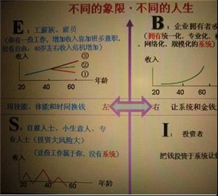 綜上所述,E、S象限的族群難以賺大錢獲得財務(wù)自由,B、I象限的族群較容易獲取錢財從而財務(wù)自由。要擁有系統(tǒng)為自己工作,才能跨入B象限,從而實現(xiàn)人人追求的財務(wù)自由。