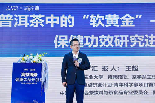 在"立信"篇章,天士力降茶通過多重科學(xué)驗(yàn)證夯實(shí)產(chǎn)品公信力。湖南農(nóng)業(yè)大學(xué)茶學(xué)系主任王超博士首先從成分本源出發(fā),權(quán)威闡述了普洱茶中的關(guān)鍵功能因子——茶褐素的科學(xué)研究進(jìn)展。他將茶褐素譽(yù)為“普洱茶中的軟黃金”,系統(tǒng)介紹了其在調(diào)節(jié)糖脂代謝等方面的獨(dú)特價值,為天士力降茶的功效奠定了堅(jiān)實(shí)的成分理論基礎(chǔ)。