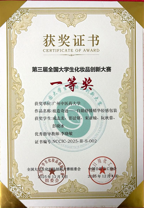完美(中國)有限公司(以下簡(jiǎn)稱“完美公司”)與廣州中醫(yī)藥大學(xué)聯(lián)培研究生的參賽項(xiàng)目《植造奇跡——白簕舒緩精華輕感包裝》斬獲第三屆全國大學(xué)生化妝品創(chuàng)新大賽“一等獎(jiǎng)”,研發(fā)中心總經(jīng)理李曉敏榮獲“優(yōu)秀指導(dǎo)教師”稱號(hào)。這一成果既是校企協(xié)同培育創(chuàng)新人才的生動(dòng)例證,更彰顯了完美公司在科技轉(zhuǎn)化、綠色可持續(xù)發(fā)展領(lǐng)域的行業(yè)引領(lǐng)力。